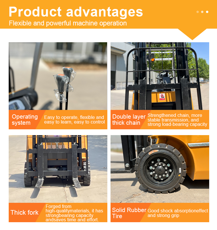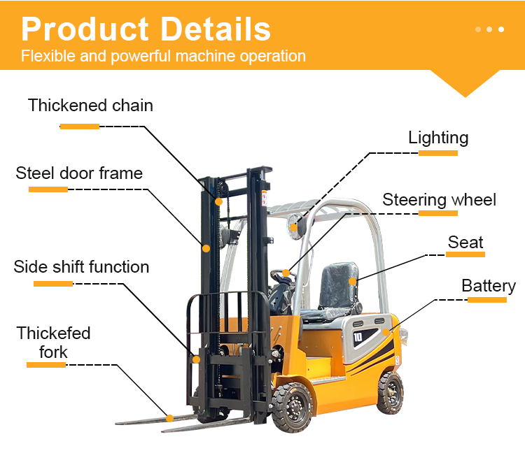 Engineered for agility and reliability, our 1-ton electric forklift is ideal for warehouses and confined spaces. Customize critical features such as the battery configuration or add safety accessories to suit your operational needs. Its compact design ensures excellent maneuverability, while the electric powertrain provides instant power with reduced noise, contributing to a better working environment.