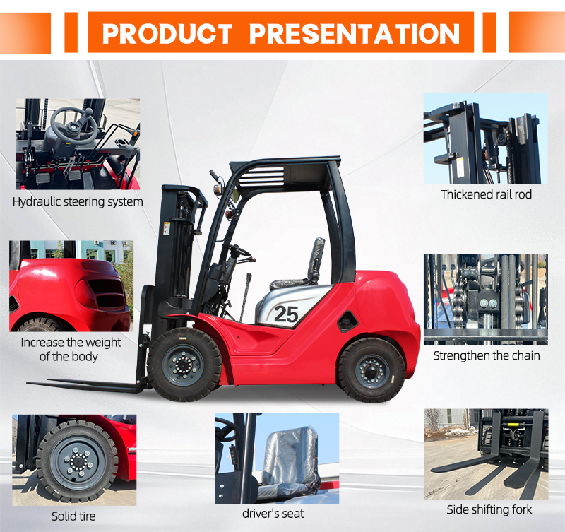 This robust 2.5-ton diesel forklift combines powerful performance with flexible customization options. Tailor the machine with specialized attachments and configurations to optimize your workflow. Key advantages include excellent gradeability, reduced maintenance costs, and enhanced operator comfort, ensuring maximum productivity in challenging environments.